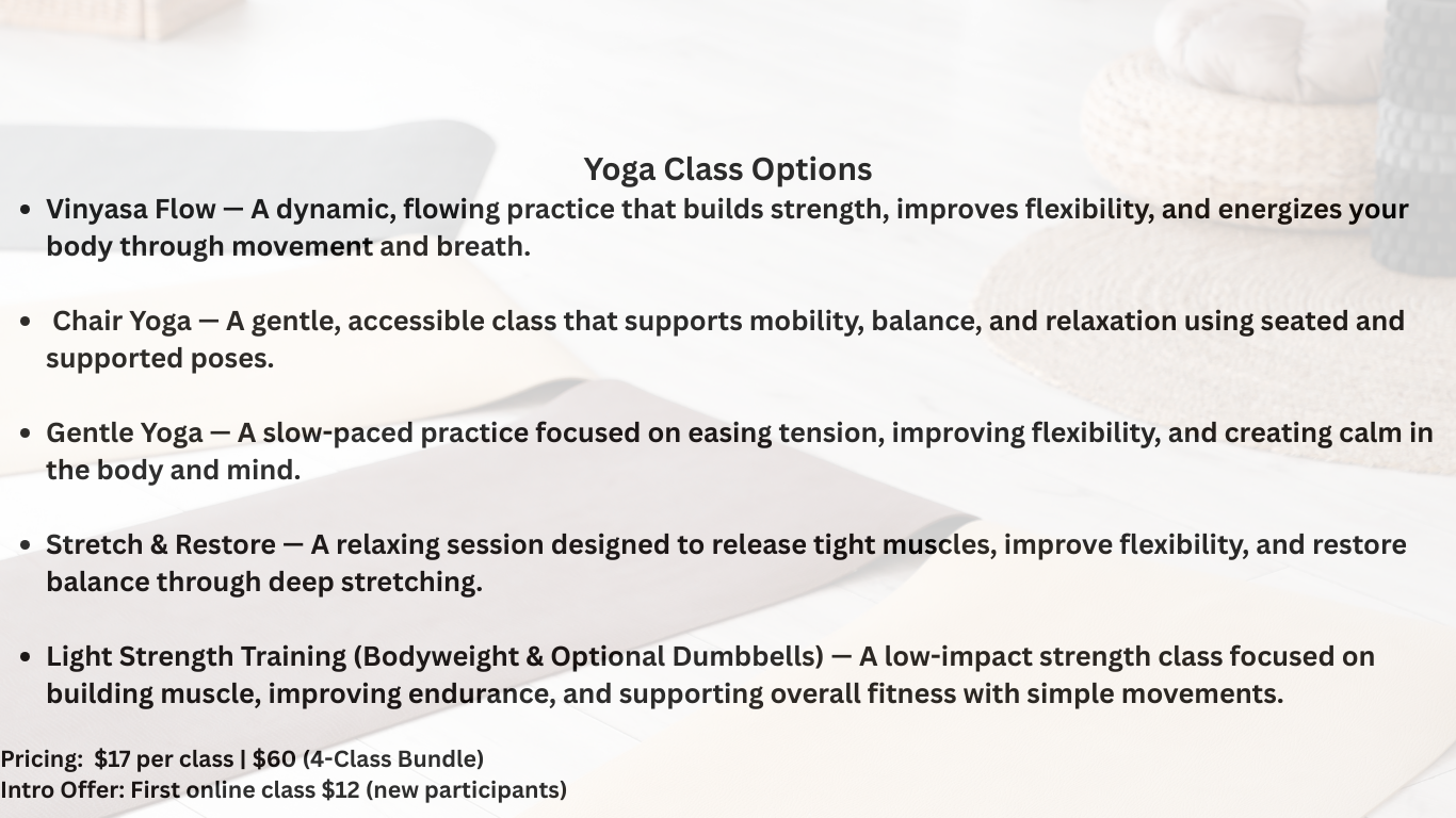 Our yoga classes invite you to move with intention, breathe with purpose, and care for your body in a way that feels good. Whether you’re just beginning or continuing your practice, each session supports your strength, flexibility, and inner peace.